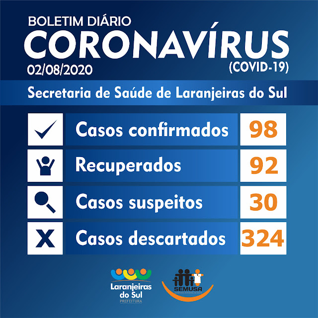 Hoje mais dois casos positivos de coronavirus, por contato domiciliar, em Laranjeiras do Sul. Um do sexo masculino, 46 anos e outro do sexo feminino, 42 anos. Os dois encontram-se em isolamento domiciliar.