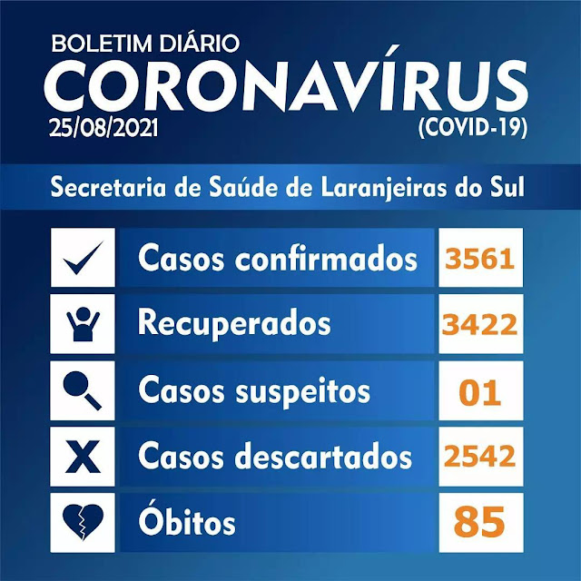 Laranjeiras do Sul registrou 3 novos casos da Covid-19 de acordo com o boletim divulgado nesta quarta-feira, 25. Os exames foram confirmados pela Central de Testes Rápidos.
